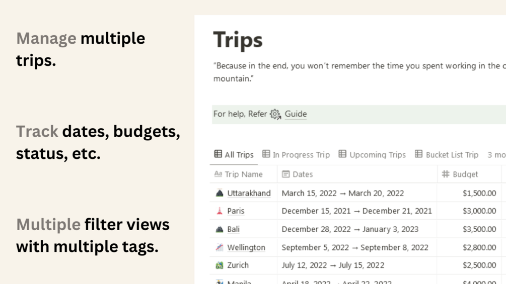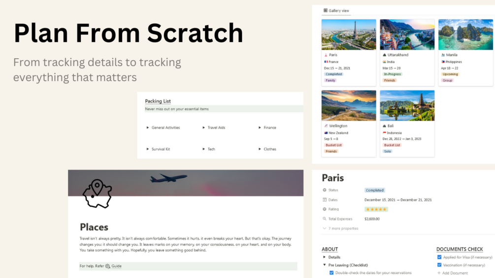 It organizes your bucket lists from scratch and helps you to convert them into the most cherishable memory. It will be the most valuable asset to your existing notion workspace if you are a traveler or someone who is looking to explore more of this world.
