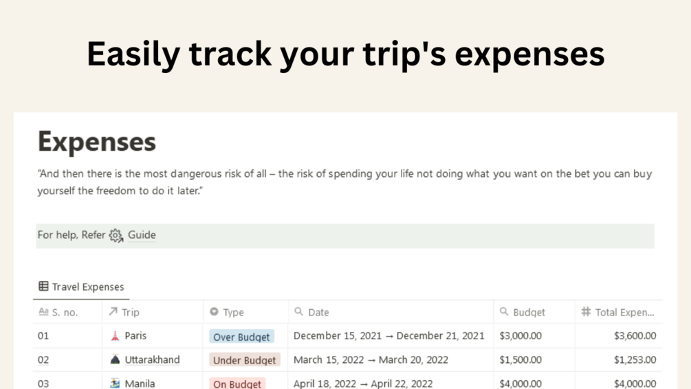 This Planner will help you to turn your travel bucket list into a bulletproof action plan and help you manage all your adventures in a single common workspace.