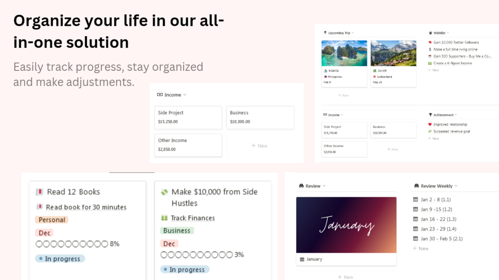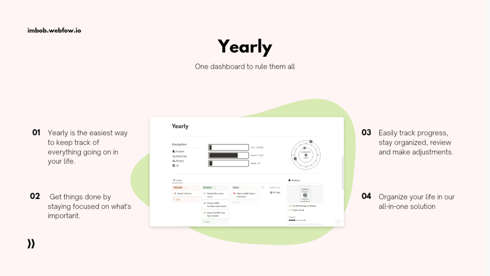 Unlike other templates, Yearly combines all of your important information and tasks in one place, making it easy for you to stay organized and focused. With Yearly, you won't have to waste time searching for information or constantly switching between apps.